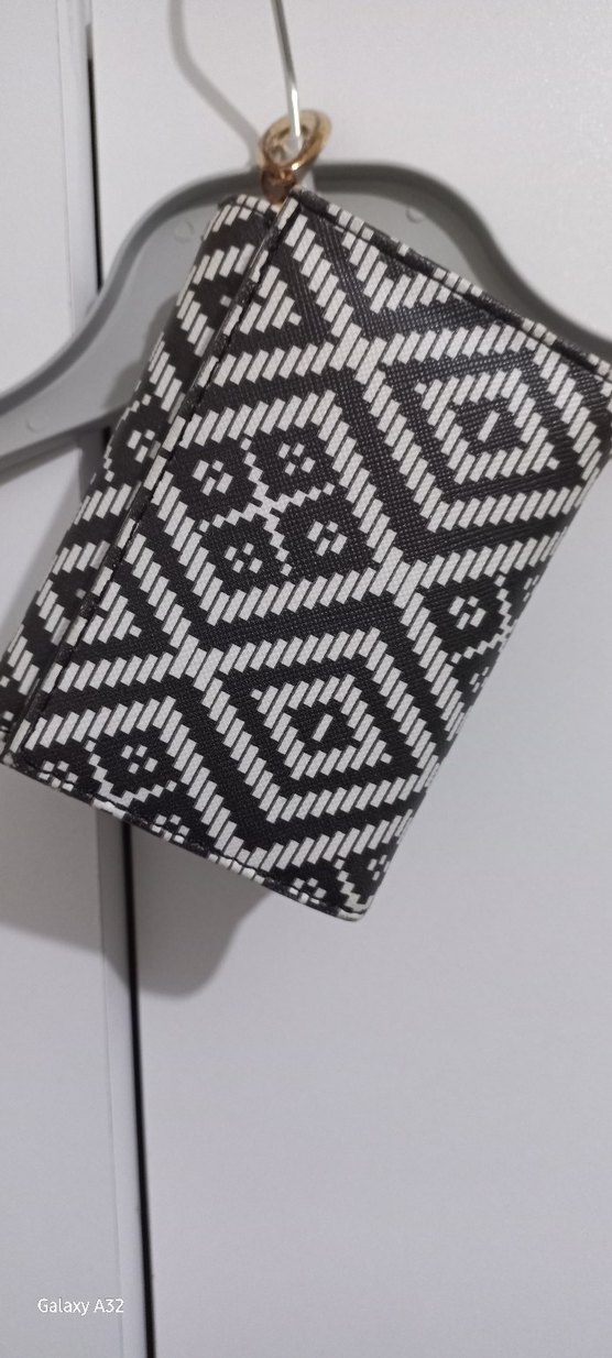 Bu çağdaş kadın cüzdanı, fermuarlı kapanışa ve siyah-gri geometrik desene sahiptir. Minimalist ve bohem tarzlara uygundur.