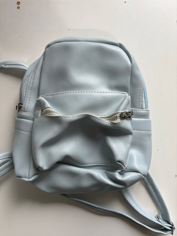 Minimalist tarzda, mavi deri ve fermuarlı ön cepli günlük kullanım için uygun sırt çantası.