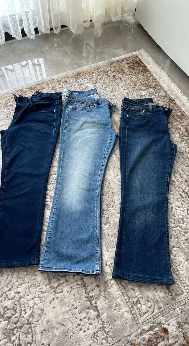 Farklı mavi tonlarında, bol kesim kadın denim kot pantolonlar. Günlük kullanım için rahat ve zahmetsiz şıklık sunar. Midi boy, desensiz tasarım. Üç kot pantalon fiyatıdır