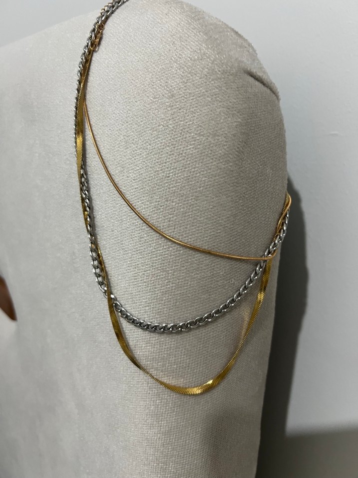 Günlük kullanım için altın ve gümüş renkli zincir detaylı, normal midi uzunlukta çağdaş kadın kolyesi.