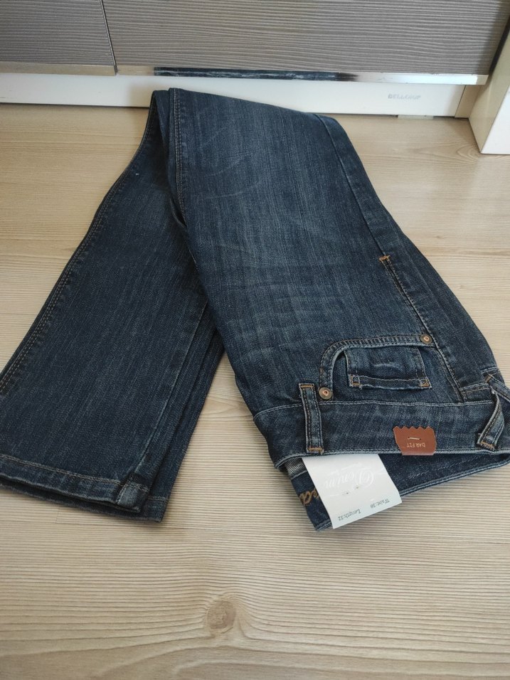Lacivert renkte, kemerli günlük kullanım için kadın kot pantolon. Denim kumaştan, rahat kesimlidir.