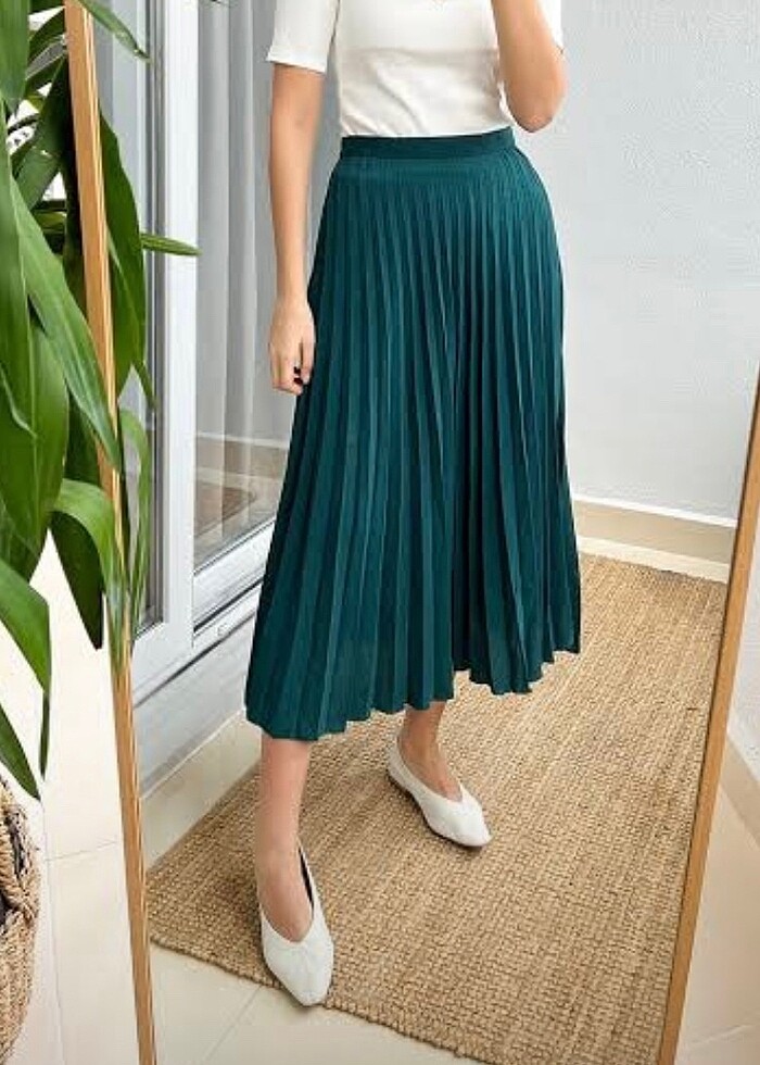 Gardırobumda yer açmak için satıyorum! Çok şık ve rahat bir petrol yeşili pileli midi etek. Hem günlük kombinlerde hem de özel günlerde rahatlıkla kullanılabilir. Bel kısmı fermuarlı olduğu için rahat ve konforludur.