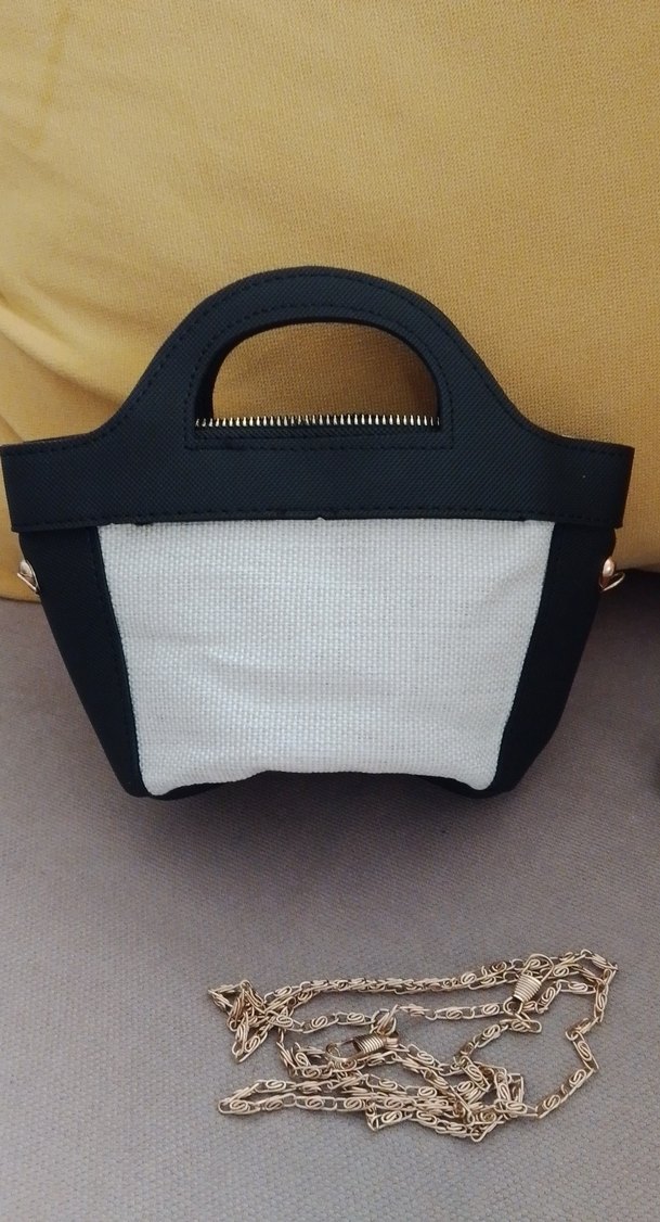 Sentetik kumaştan yapılmış, kemerli tasarıma sahip minimalist kadın çantası. Siyah ve krem tonlarında, günlük kullanım için uygundur.