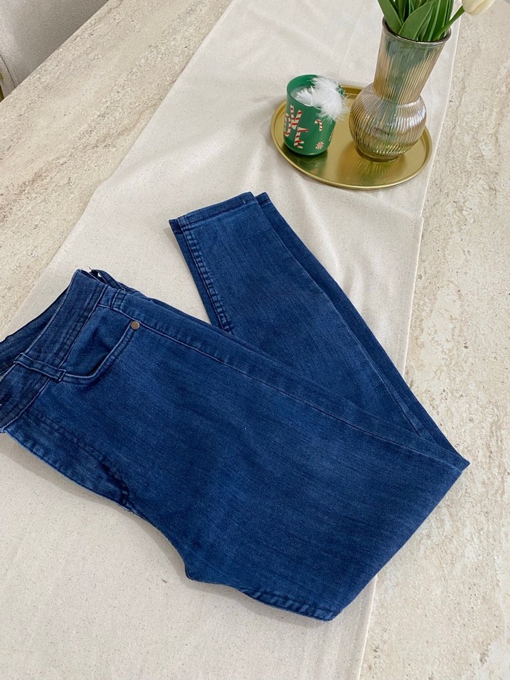 Mavi denim kumaştan, regular fit ve günlük kullanıma uygun, desen içermeyen rahat ve şık kadın pantolonu. Skinny
