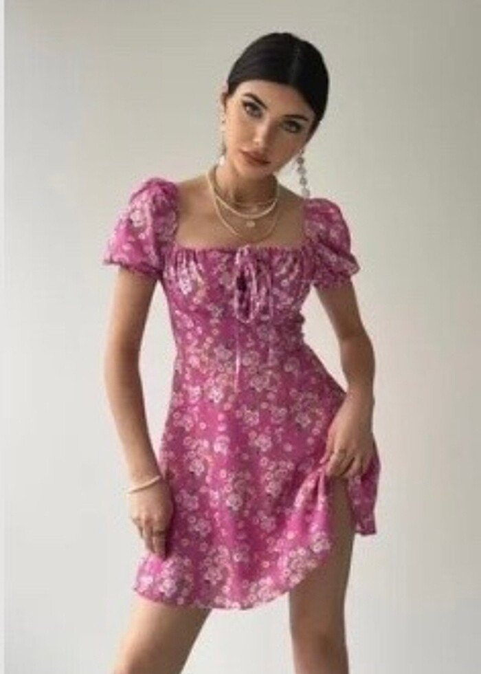 Çiçek Desenli Astarlı Balon kol Mini Elbise