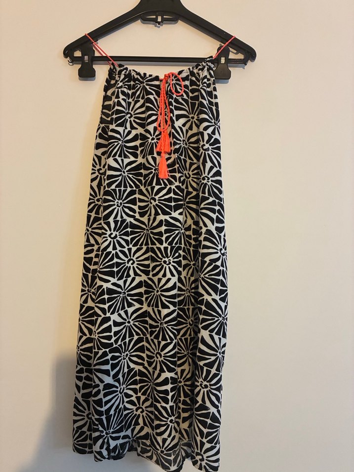 Siyah ve gri çiçek desenli, askısız ve bol kesim uzun elbise, turuncu püskül detaylarıyla bohem tarzını yansıtıyor. Bir kaç kez giyildi. Sorunsuz.