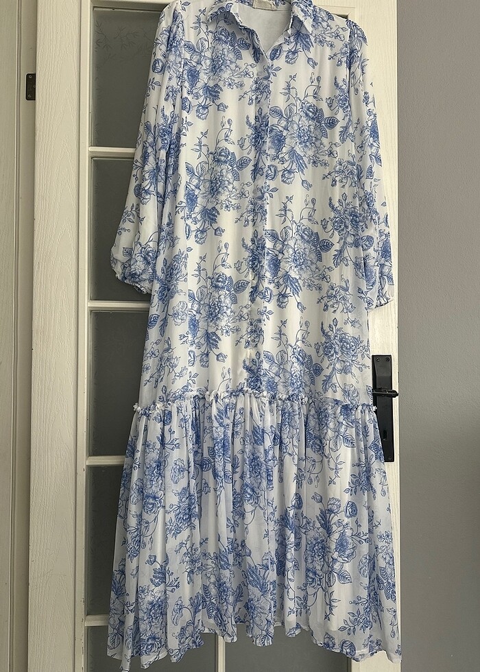 Beyaz üzerine mavi çiçekleri olan içi astarlı kendinden desenli tülü ile ister günlük ister özel günlerinizde sizi iyi hissettirir. İster kemerli isterseniz kemersiz kullanım yapılır 36 yazıyor ama geniş kalış 42 ye kadar rahat olur. Zeruştan alınmıştır. Hiç bir kusuru yoktur.