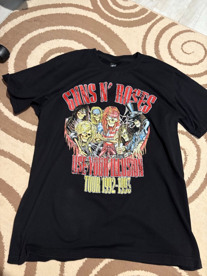 Siyah, baskılı Guns N' Roses desenli, kısa kollu, bisiklet yaka, bol kesim erkek tişörtü.