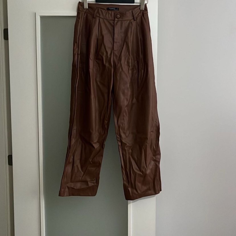 Kahverengi deri, midi boy, pilili ve regular fit kadın pantolon. Minimalist ve trend günlük stil için uygundur. Kahverengi, deri görünümlü, pileli pantolon. Şık ve rahat bir kesime sahiptir. İçi pamuklu şardonlu harika bir pantolon, lütfen vereceğim ölçülere göre değerlendirin, bel kemer 38 cm, boyu 105 cm, iç bacak boyu 70 cm,basen 63 cm,belden ağ bölgesine uzunluk 34 cm muhteşem bir pantolon tüm detayları fotoğraflarda mevcuttur,güncel durumu sadece bir kere giyildi