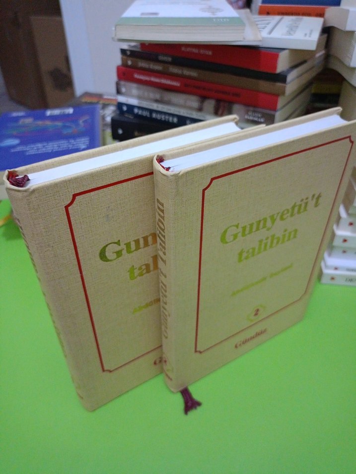 Üniversite kitapları kategorisinde, kırmızı detaylı bej kapaklı 'Gunyeti't Talibin' adlı iki ciltlik kitap seti.