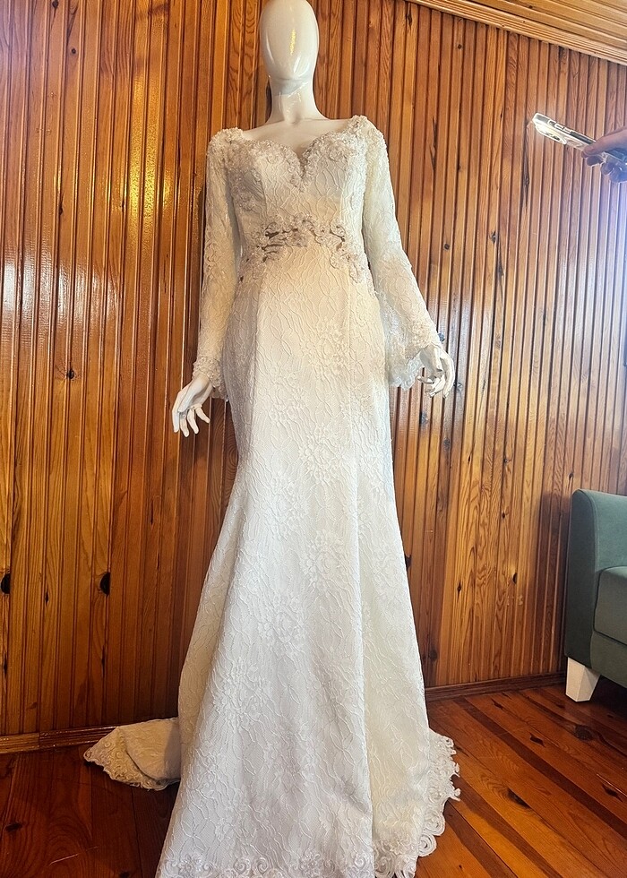 Kuru temizleme yapılması gerekmektedir. Boncuk ve pul işlemeli Fransız güpür gelinlik