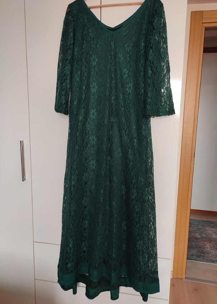 Bir kez gydim.ön ve arka yaka V şeklindedr.önü bi tık kısa,arkası daha uzundur.7-8 cm topukla gydim. Hoş bir arka görüntüsü vardr. Kuyruklu yani.kolları dirsekten braz daha uzun.46- 48 bedene rahatlikla oluy.belden oturtmalı,alti geniş.ic astari vardr.astari esnektir.