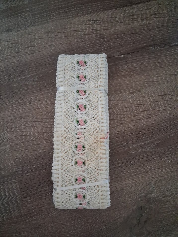 Bohem tarzda, krem renginde, pembe çiçek desenli ince örgü dantel şerit. hic açılmadı.göründügü gibi gonderim yapacağım 10 metrelik.