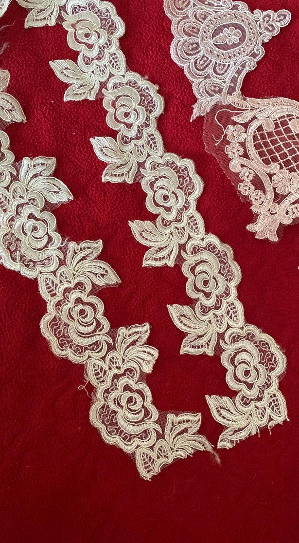 96 cm. boyunda hiç kullanılmamış zarif krem rengi Güpür. Havlu ve yastık tasarımı için.