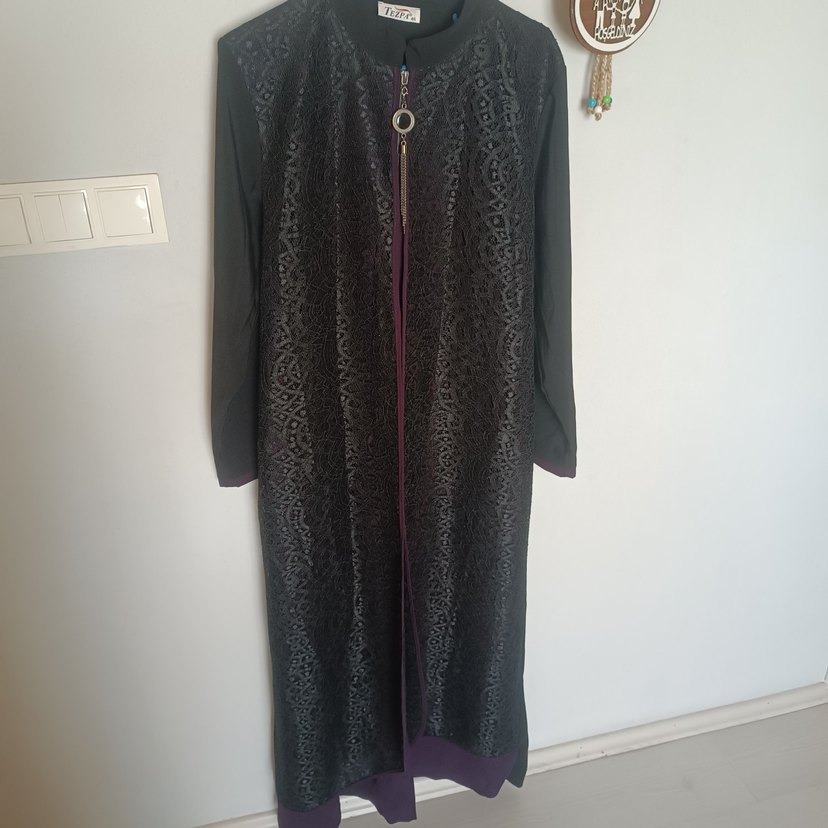 Uzun, bol kesim koyu mor renkte güpür desenli. Uzun kollu, kesik yaka ve fermuarlı ön kısmı ile gotik tarzda ofis kullanımı için uygun.