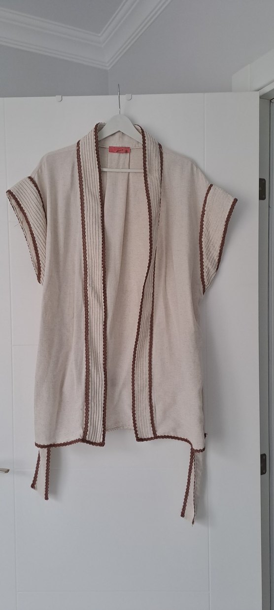 pantolon ve etek üstüne uyumlu keten kumaş krem rengi kuşaklı yelek sadece 1 kez giyildi