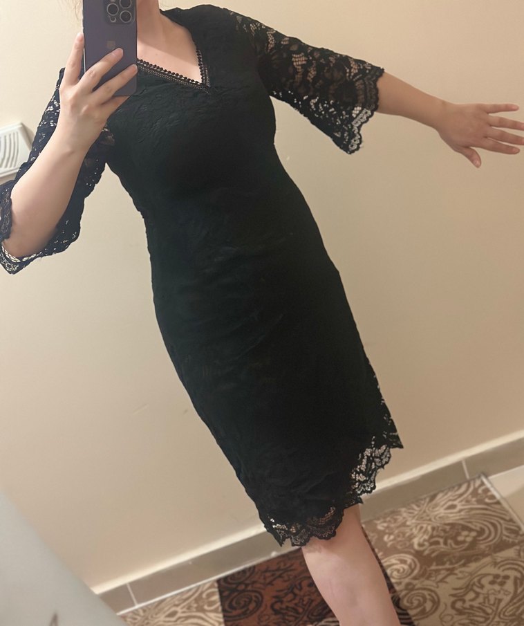 Dantel detaylı, V yakalı, yarım kollu siyah midi elbise. Gotik tarzda, romantik akşamlar için uygun.