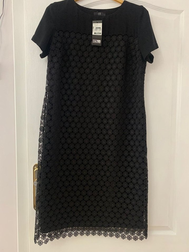 Kısa kollu, bisiklet yaka, işlemeli dantel detaylarıyla klasik ve şık siyah midi elbise, ofis kullanımına uygundur. Etiketi üzerindedir sıfır üründür, tertemiz ve çok şık