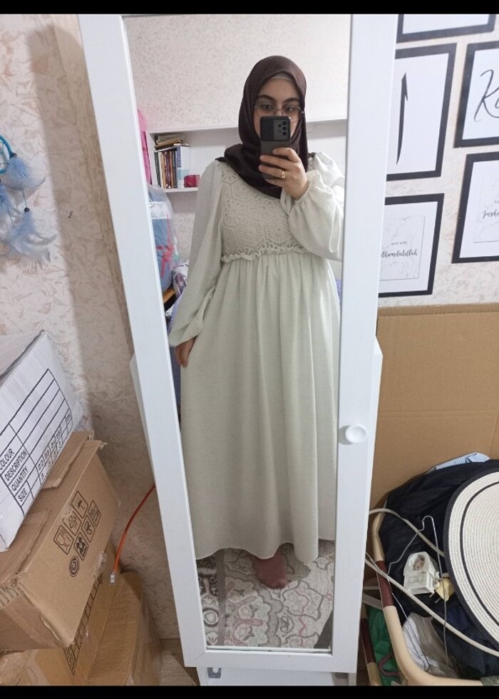 Üstü güpür beli ve bileği lastikli çok rahat bir elbise en fazla 80 kiloya olur