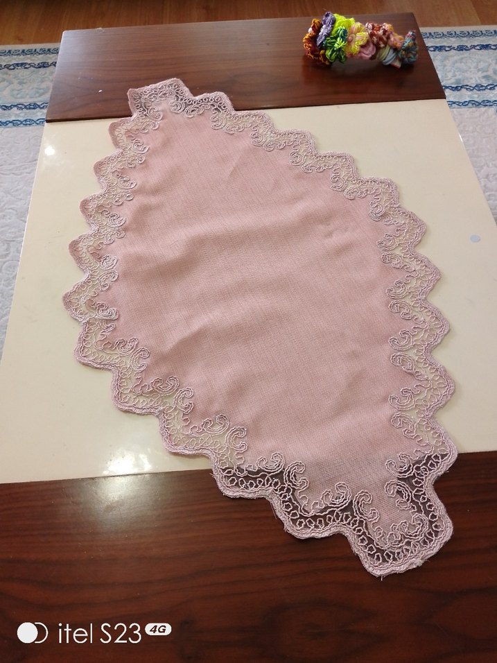 Pembe renkte, pastel tonlu vintage sehpa örtüsü, zarif nakışlı kenarlarıyla masanıza ince bir dekoratif hava katıyor. linen kumaş.kullanilmamis. 50/80