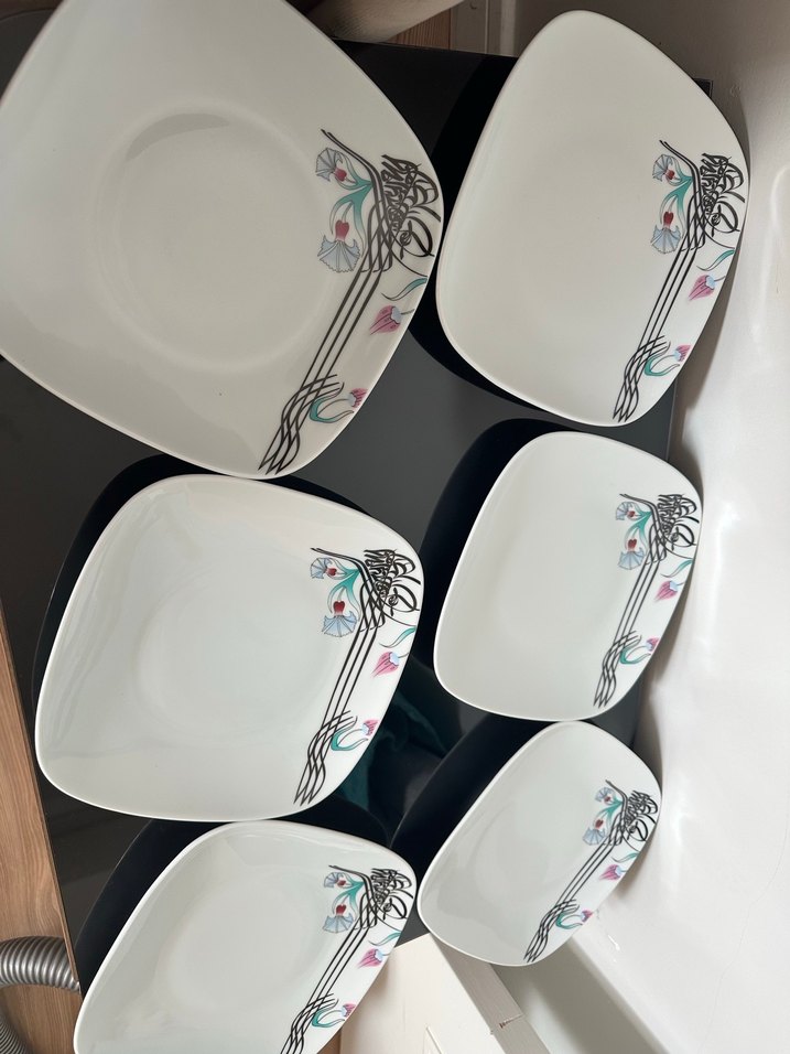 Beyaz kare tabaklardan oluşan 6'lı set, koyu renkli çiçek desenleriyle servis için uygundur. ️
