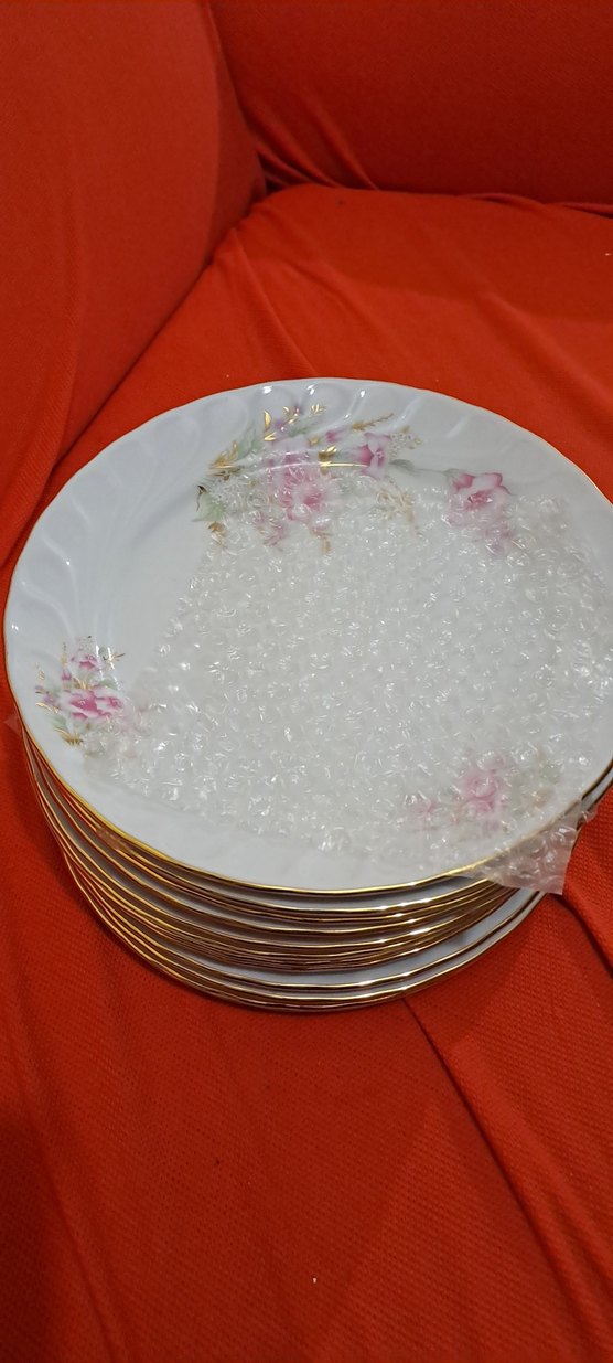 Altın kenarlı, beyaz porselen tabaklar üzerinde narin pembe çiçek desenleri bulunur. Parlak yüzeylidir ve düzenli şekilde üst üste konmuştur. ️gural porselen 12 adet takim capi 25 cm tek fiyat al git aldim diyene bu fiyat sondur gural porselen desi fazlasi da benden cikacak 1000 tl uzeri islemden de benden cikacak parasi