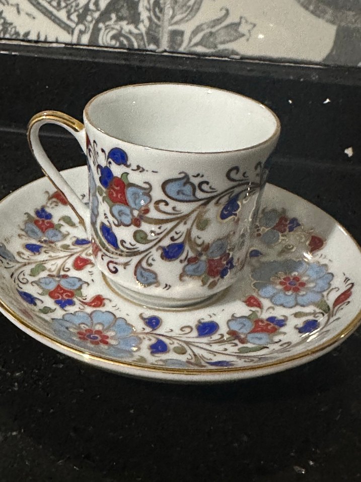 Güral Porselen ince porselenden yapılmış, koyu mavi, kırmızı ve yeşil çiçek desenleri ile süslenmiş, altın detaylı fincan ve tabak seti.
