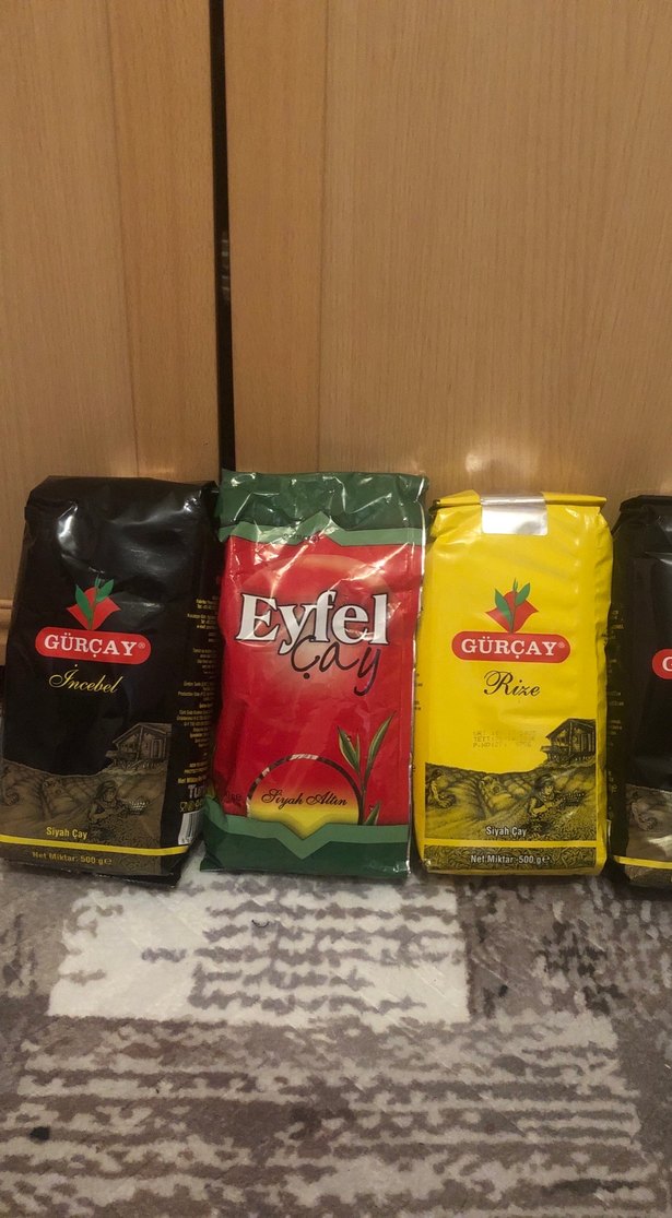 Gürçay ve Eyfel markalarına ait farklı çay çeşitlerini içeren koyu ve haki renkli paketler.