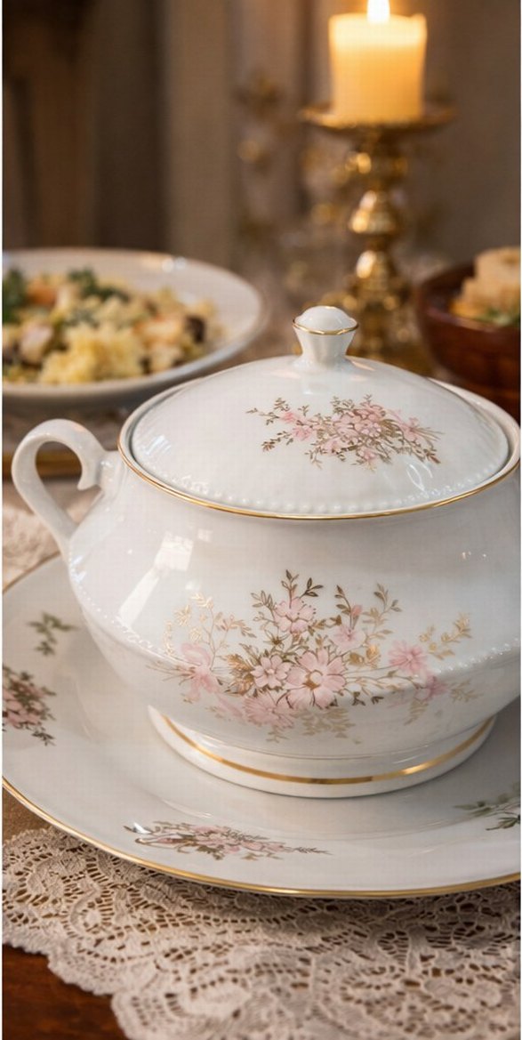 Pastel çiçek desenli beyaz Porselen Corba Tenceresi, kapaklı, kulplu klasik tasarım.