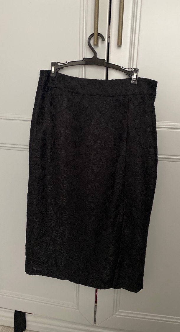 Saten dokulu, dantel detaylı siyah midi kalem etek, ofis için gotik tarzda şık bir seçimdir.