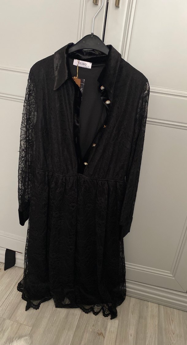 Düğmeli, uzun kollu siyah elbise, notched lapel yakalı ve bol kesimdir. İş ortamına uygun, nakışlı ve sentetik kumaştan yapılmıştır.