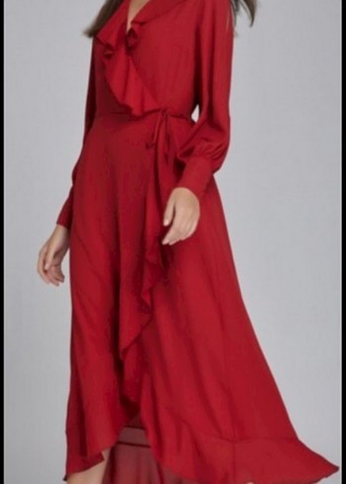 Kırmızı, uzun kollu, V yaka ve fırfır detaylı, bol kesim kadın elbisesi. İpeksi dokusuyla romantik ve bohem tarzı yansıtır. ❤️