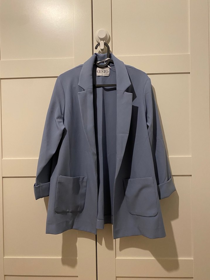 Mavi renkli, notched lapel yakalı ve uzun kollu midi uzunlukta kadın blazer ceket. Düz dokusu ve rahat kesimi ile ofis ve günlük şıklık için uygundur.