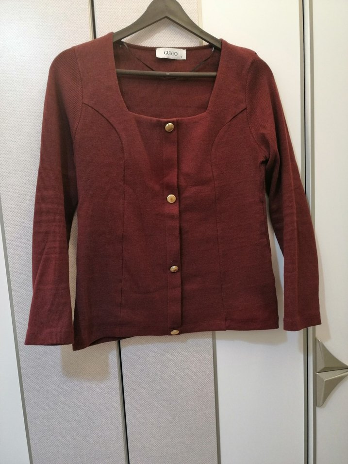 Gusto Pamuk Bordo, düğmeli, yuvarlak yakalı ve uzun kollu kadın hırkası. Rahat kesimli, günlük kullanıma uygun.Sadece bir kez kullanıldı