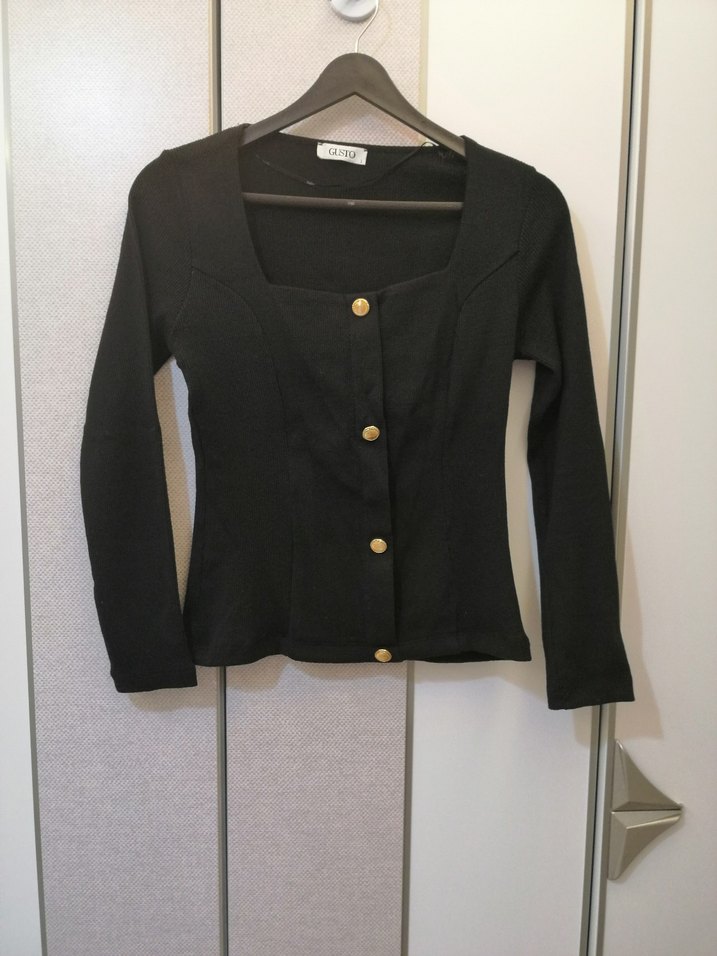 Gusto Pamuklu Düğmeli, uzun kollu, bisiklet yaka, siyah kadın hırka. İnce dokuma kumaştan, modern klasik tarzda, günlük kullanıma uygun.Sadece bir kez kullanıldı
