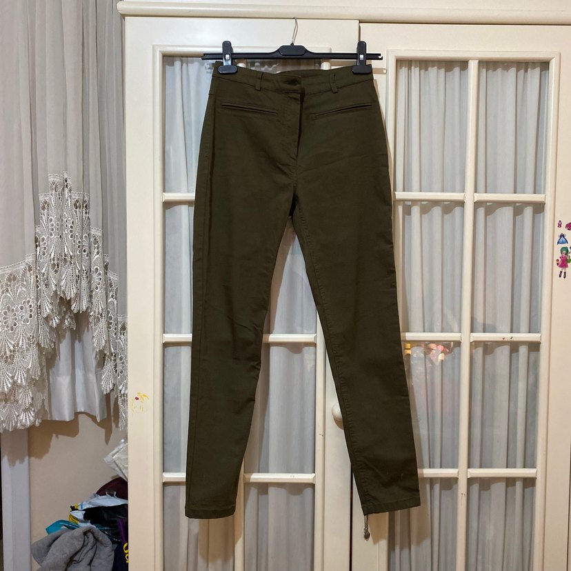 Kadınlar için haki renkli, kemerli kumas gorunumlu pantolon. Regular fit ve midi boyda, desen içermeyen rahat ve şık tasarım. Ofise uygun casual tarzda.