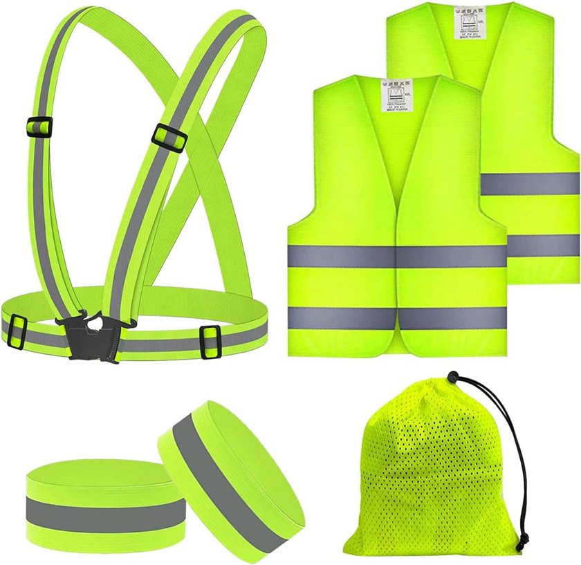 Sarı renkli çocuk güvenlik seti; reflektörlü yelek, ayarlanabilir cırt cırtlı plastik bantlar ve saklama filesi içerir.