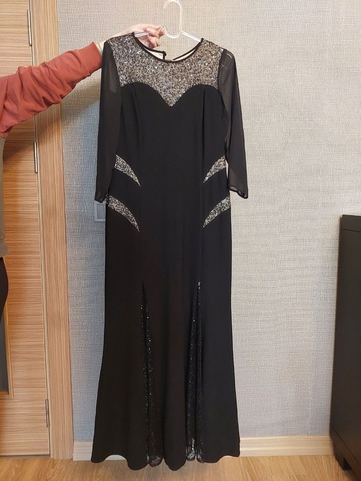 GZN Marka Siyah Abiye 46 Beden üst kısımda kumaş üzerine pul işlemesi var, kolları tül, etek kısmındaki detaylarda pul işlemeli kısımla astarı ayrı.