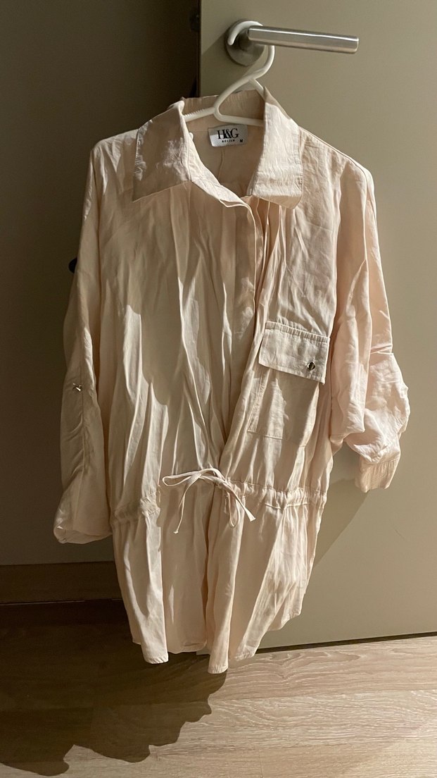 1500₺ dir Palazzo pantalonlu gömlek fiyat Bej keten kumaştan, uzun kollu ve yakalı kadın tulumu. Salaş kesim ve drapeli tasarıma sahip, günlük sokak modası için ideal. Midi boy ve desensiz.