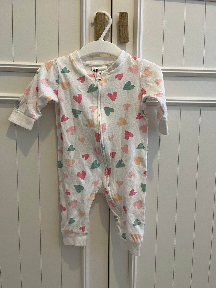 H&m 1-2 ay kız bebek fermuarlı tulum, renkli kalp desenli beyaz