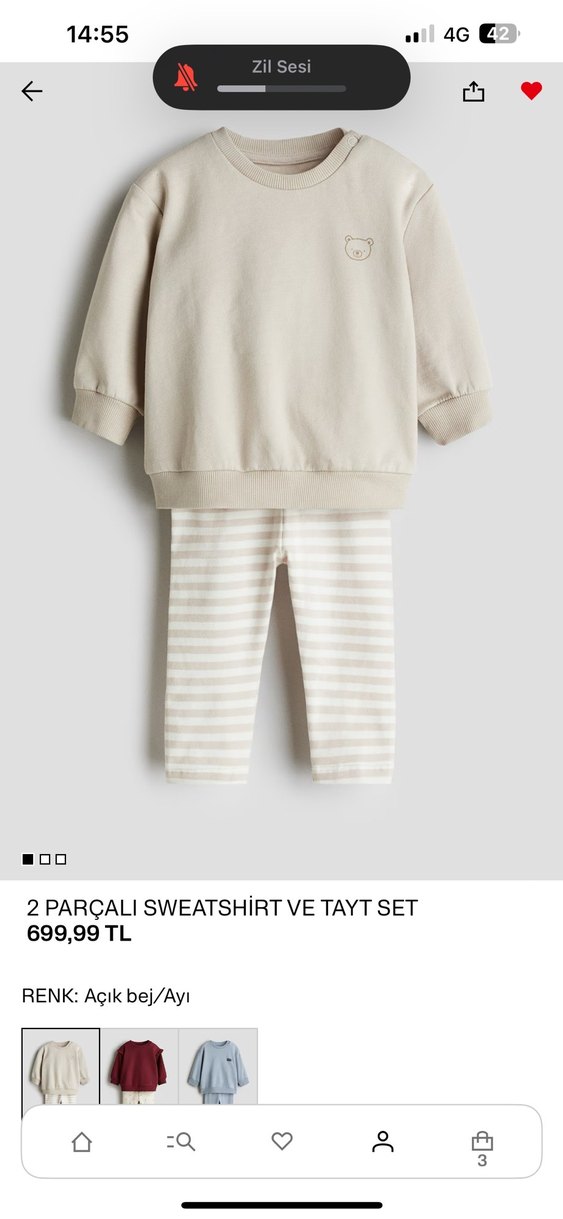 Uzun kollu bej sweatshirt ve çizgili tayttan oluşan yumuşak ve rahat bebek takım 2/3 yaş 0 etiketli.