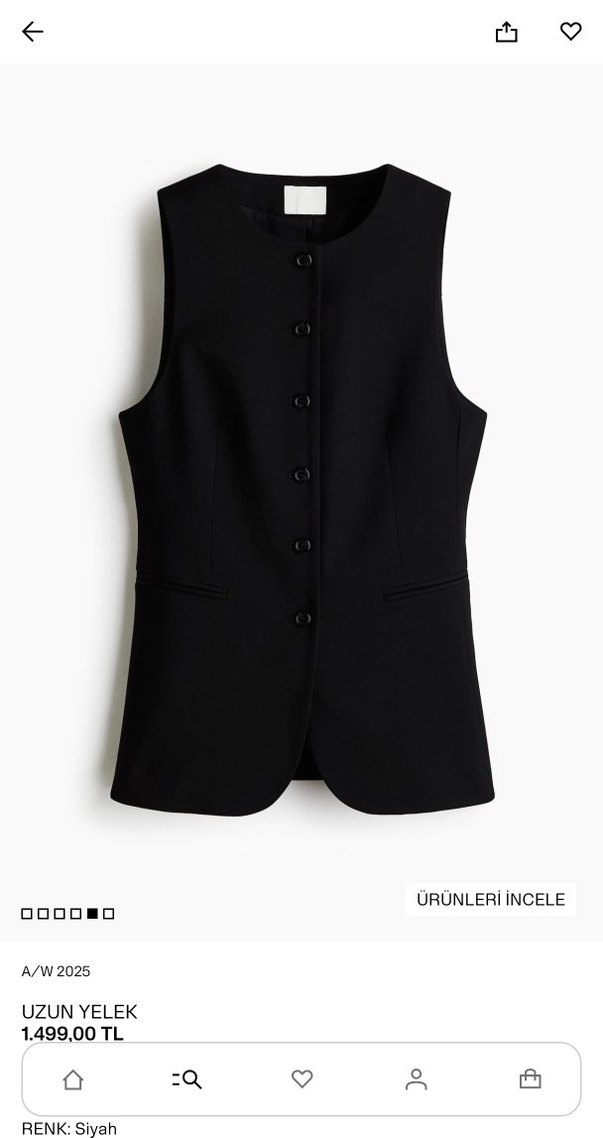 H&M 38 beden uzun yelek.Etiketli üründür.Dar kalıptır.38 beden ama 34 veya 36 bedene uygun.Ölçülere dikkat ediniz.İki koltuk altı arası: 42cm Boy: arka enseden 62cm önden 65cm SON FİYATTIR.