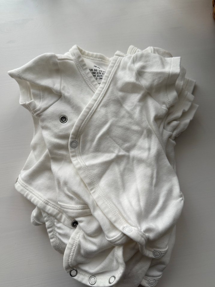 Düğmeli, kısa kollu beyaz bebek hastane kıyafeti, yumuşak keten kumaştan, sade normcore tarzında. Rahat ve desensiz tasarım.