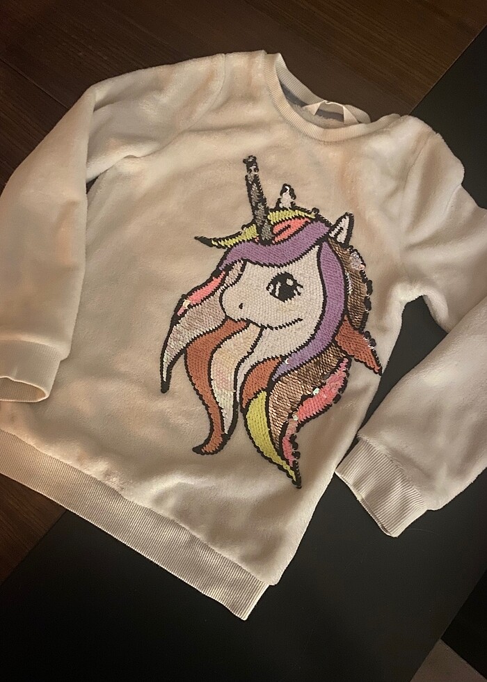 6-8 yaş, polar sweatshirt, unicorn pulları çift yönlü, fotolarda mevcut. 2 kez giyildi. Leke, sorun, vb yoktur. Ölçüler fotolarda mevcuttur. Yumuşacık ve sıcak tutar. Fazla esneyen bir kumaş değildir.