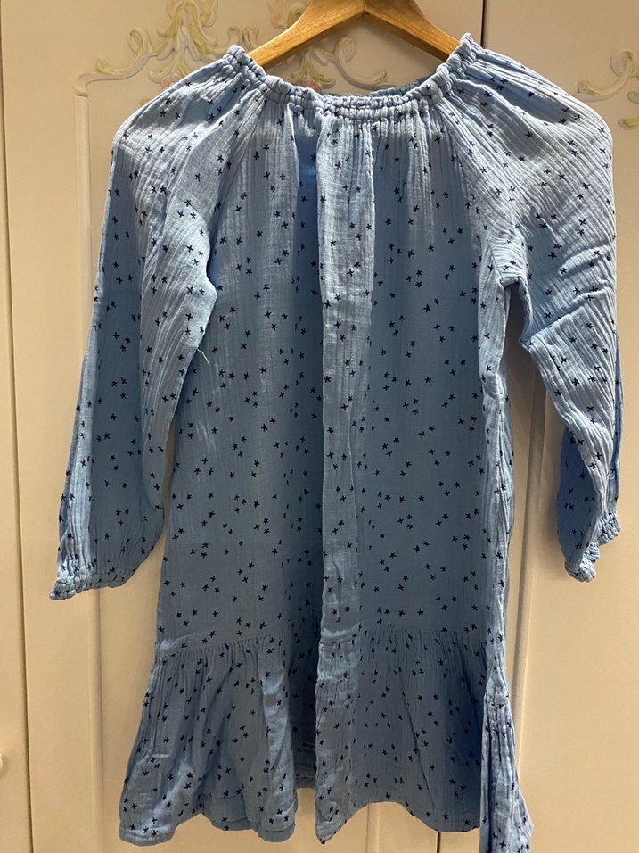 Yumuşak keten kumaştan, bol kesim kız çocuk elbisesi. Uzun kollu, düğmeli ve V yakalıdır. Bohem tarzda gri tie-dye desenlidir.