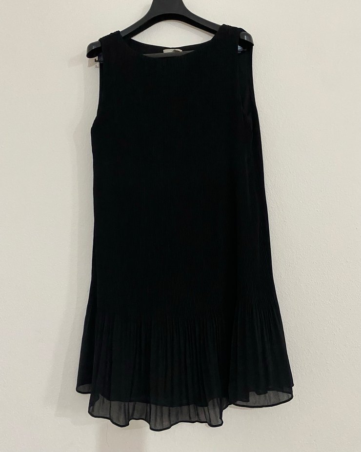 Sentetik kumaştan, pilili detaylı ve baskılı desenli normal boy, elbise Romantik akşamlar için avant-garde normcore tarzına uygun.