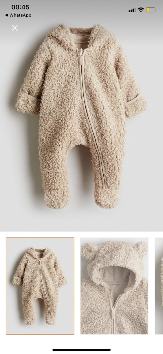 Önden fermuarlı, yumuşak ve sıcak bej renkli, kürk detaylı bebek tulumu.