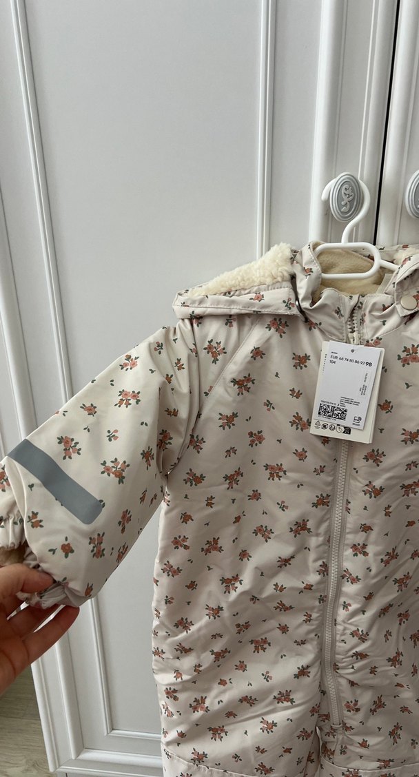 Bej renkli bebek tulumu, çiçek desenli baskıya ve kürklü kapüşona sahiptir. Kollarda gri reflektör detayı bulunur. ❄️ 0 etiketli son fiyat