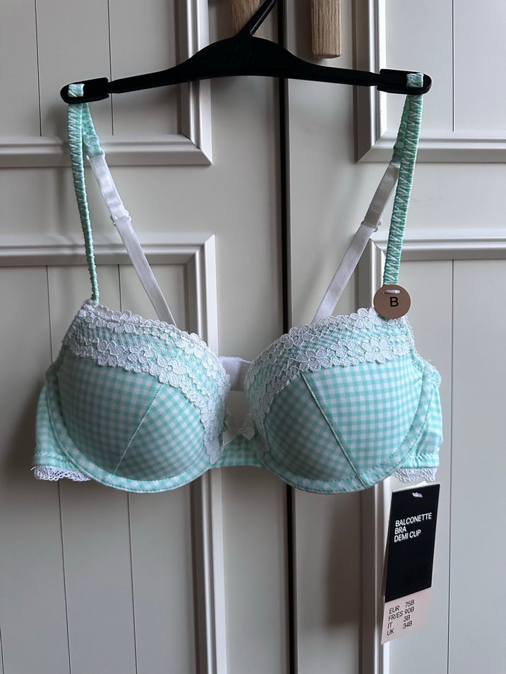 Sıfır ürün etiketli.Yeşil renkte, ekoseli desene sahip, dantel detaylı, ped destekleri çıkabilen bir sütyen