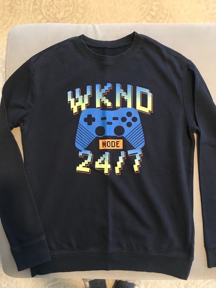 Yumuşak lacivert renkli, baskılı oyun kolu desenli, düğmeli, uzun kollu, bisiklet yaka, bol kesim erkek sweatshirt